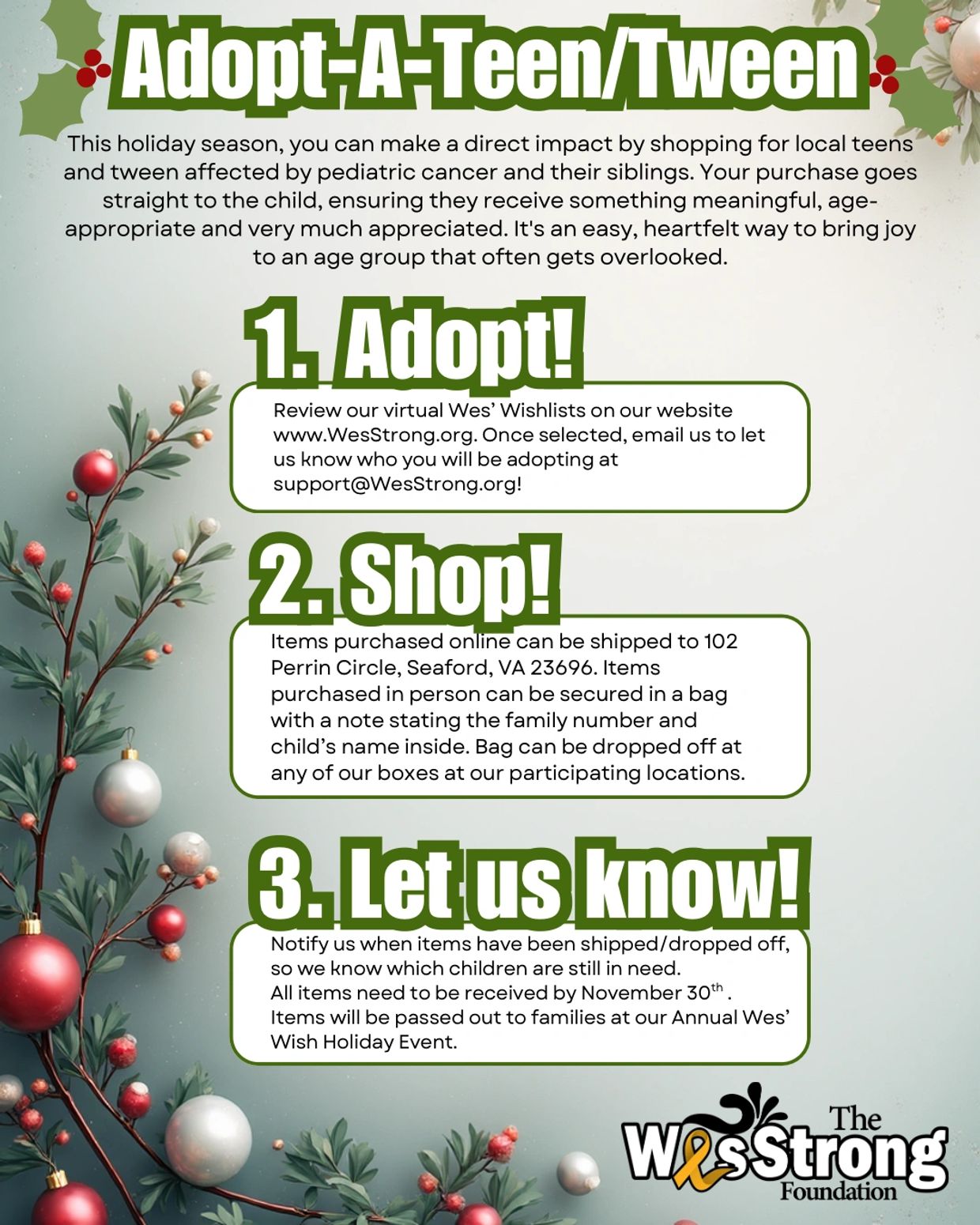 Adopt a local teen or tween impacted by pediatric cancer this holiday season! This age group is oftentimes overlooked this time of year. Help us make it special for them too letting them know they are not forgotten! Click the link below or email us at Support@Wesstrong.org to let us know which child or children you would like to support.